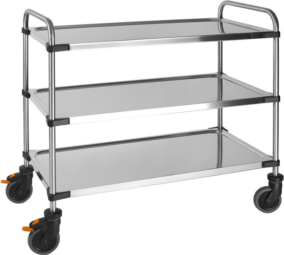 Rieber Servierwagen SW-850 RL-3 Besondere Merkmale: › Schraubkonstruktion (unmontiert)› leichte Ausführung (ohne Schweißnähte)› schallgedämmt› tiefgezogene Borde mit Stopprand› Stoßecken an jedem Bord Ausstattung: › rostfreie Rollenausstattung mit 4 Lenkrollen ø 125 mm, 2 davon feststellbar› Lichtmaß zwischen den Borden: 275 mm› Rundrohr-Schiebebügel› max. Flächenbelastung pro Bord: 80 kg› Leergewicht: 17 kg Material: › Edelstahl rostfrei