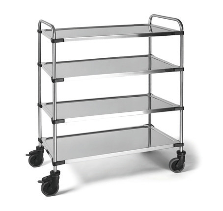 Rieber Servierwagen SW-1060 RL-4 Besondere Merkmale: › Schraubkonstruktion (unmontiert)› leichte Ausführung (ohne Schweißnähte)› schallgedämmt› tiefgezogene Borde mit Stopprand› Stoßecken an jedem Bord Ausstattung: › rostfreie Rollenausstattung mit 4 Lenkrollen ø 125 mm, 2 davon feststellbar› Lichtmaß zwischen den Borden: 275 mm› Rundrohr-Schiebebügel› max. Flächenbelastung pro Bord: 80 kg› Leergewicht: 28 kg Material: › Edelstahl rostfrei