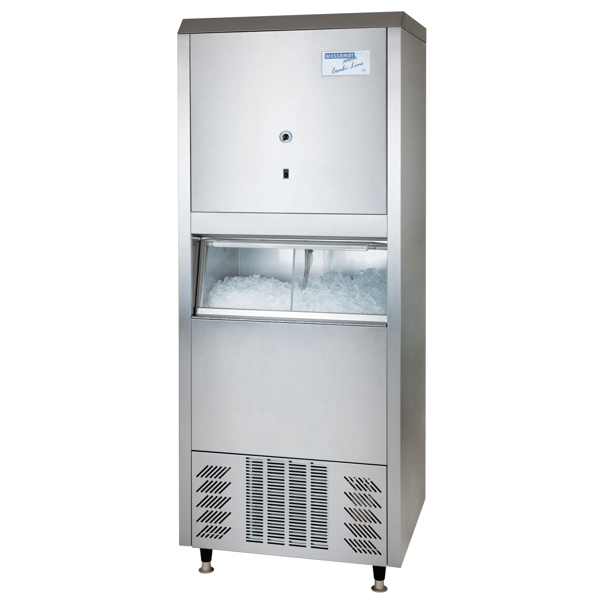 Wessamat Eiswürfelbereiter für Hohleiskegel und Crushed-IceCombi-Line W 80 ECLMade in Germany mit 2 Jahre Fachhändler-Gewährleistung Kompaktes Premium-Gerät zur Herstellung von kristallklaren und hygienisch einwandfreien Eiswürfeln / Crushed-Ice für Cocktail-Bars, Restaurants, Hotels und andere Gastronomiebetriebe mit einem kleinen bis mittleren Bedarf Eiswürfelformat: Hohleiskegel, 16 g, einzeln geformt, ø 33 x 37 mm Besondere Merkmale: › zusätzliches Mahlwerk für Crushed-Ice› geräuscharme Eisbereitungstechnik (Wellentechnik)› automatische Restwasserentleerung nach jeder Produktionscharge› hygienischer Vorratsbehälter aus Edelstahl mit doppeltem Boden und Drainagesystem› keine Wasserenthärtung notwendig › leichte Reinigung durch abgesenkte Wanne Ausstattung: › luftgekühlt› zur freistehenden Installation› Gehäuse und Vorratsbehälter aus Edelstahl› geteilter Vorratsbehälter› steckerfertig mit Anschlussleitungen Arbeitssicherheit / Leistung: › HACCP-konform› 80 kg Eis/Tag bzw. 5.000 Stück/Tag› Kapazität Vorratsbehälter: 67 kg› Wasserverbrauch: 2,7 l/kg Eis› Kältemittel: R 404 A (optional mit R 290 lieferbar) Lieferumfang: › Gerät› Gerätefüße, höhenverstellbar› Kabel› Anschlussleitungen