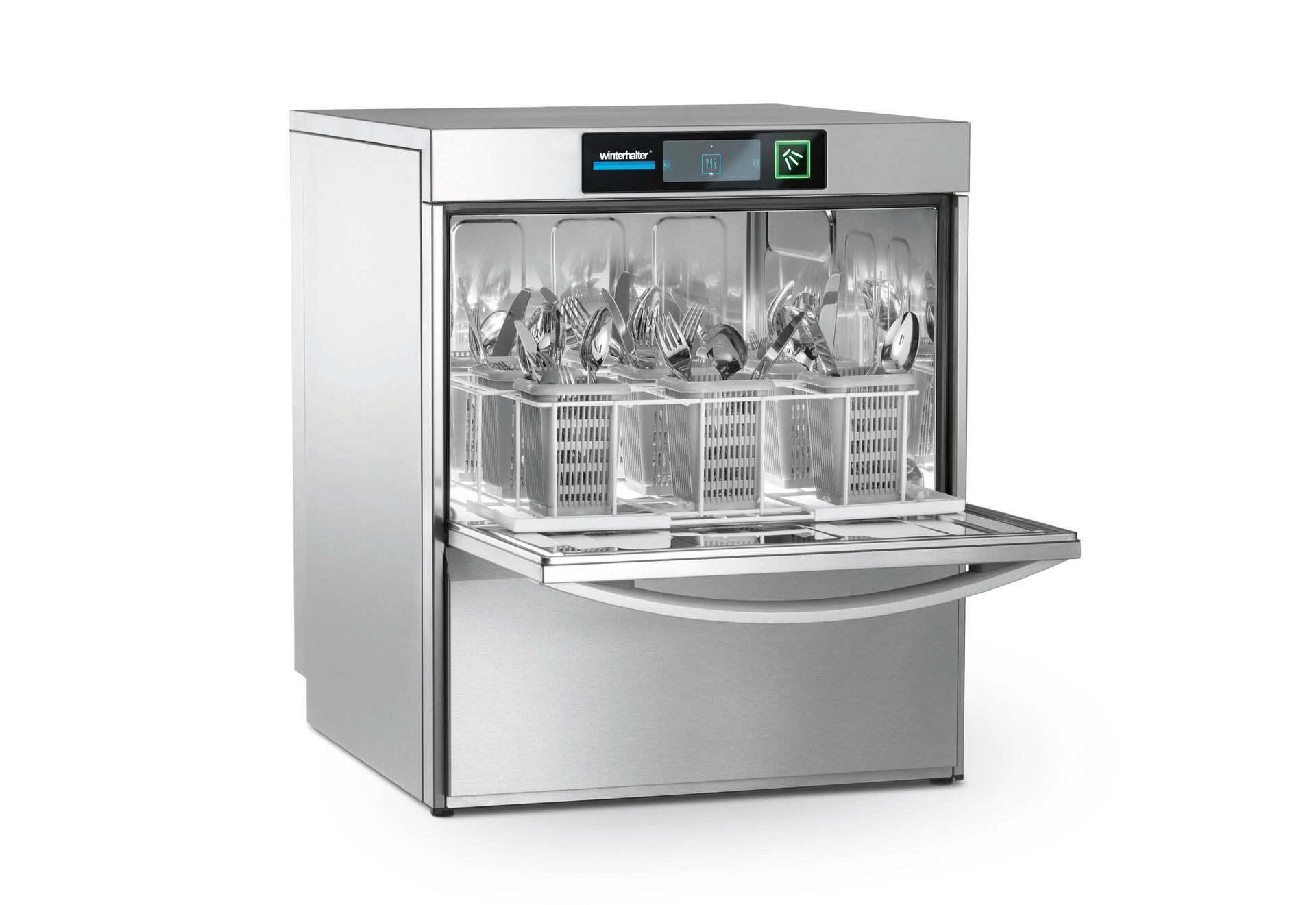 Winterhalter BistrospülmaschineUC-M Untertischspülmaschine Ausführung:› Sauglanzen mit Niveau-Überwachung für externe Ansaugung von Reiniger und Klarspüler› Reinigerdosiergerät› Klarspülerdosiergerät› Ablaufpumpe› Spülleistung: 40 / 32 / 28 Körbe/h Besondere Merkmale:› kombiniertes Spülen von Geschirr, Besteck und Glas› geräuscharm, im Thekenbereich einsetzbar› geringer Nachspülwasserverbrauch: 2,40 l/Spülgang› Spüldruckanpassung (VarioPower)› optional: internetfähig mit Auswertung und Analyse der Betriebsdaten (Connected Wash) Serienausstattung:› Touchscreen mit einfacher Bedienung über Piktogramme› farbcodierte Ein-Knopf-Bedienung› Spülfortschritt und Maschinenzustand werden optisch und akustisch signalisiert› zeitgesteuerte Inbetriebnahmeautomatik› Wartungsintervallanzeige› Sanftanlauf› elliptische Spülfelder für flächendeckende Spülkraft› druckunabhängiger Boiler› Multiphasing (Maschine mit Gleich- oder Wechselstrom verwendbar)› Sprühwasserschutz IPX3› Rückflussverhinderung zu wassertechnischen Sicherheit Hygieneausstattung:› 4-fach-Laugenfiltrationssystem mit Trübungssensor› tiefgezogener Tank, tiefgezogene Korbführung› Selbstreinigungsprogramm› integrierte Hygiene- / Betriebstagebücher Spülmaschinenprogramme:› 3 Standardprogramme› ECO-Sparprogramm› Kurzprogramm› Silenceprogramm› Intensivprogramm› Grundreinigungsprogramm› Entkalkungsprogramm› Sonderprogramm, frei konfigurierbar Lieferumfang / Zubehör:› Gläserkorb, 5 Reihen› 2 Besteckköcher› Tellerkorb, 6 bzw. 9 Reihen› Netzanschlusskabel› Zulaufwasser- und Ablaufwasserschläuche